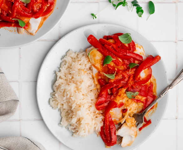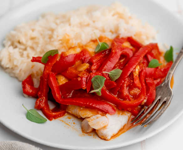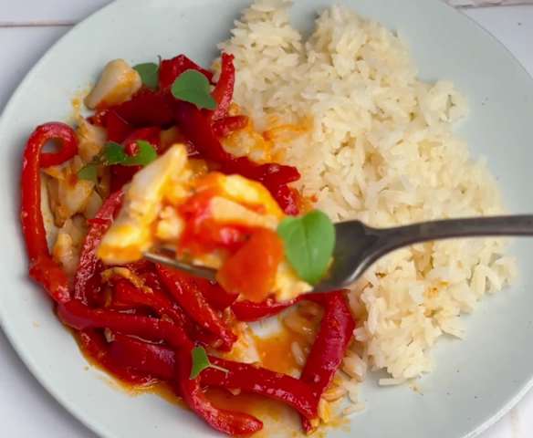 Pescado con peperonata y arroz (dieta antiinflamatoria)